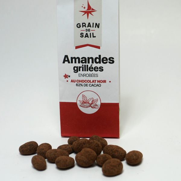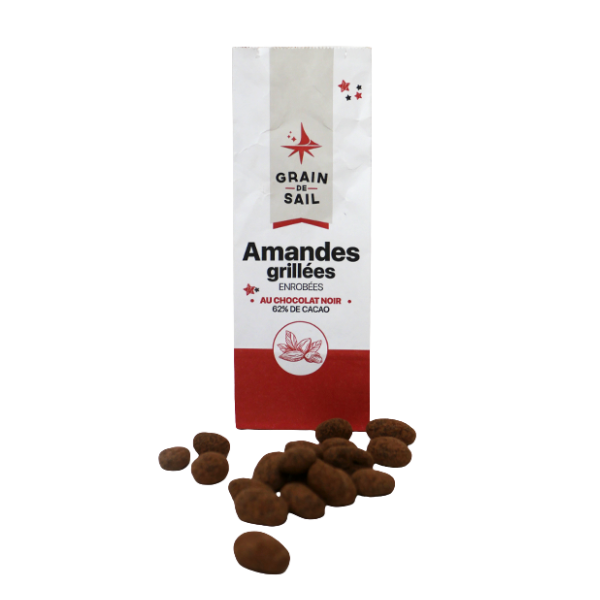 Amandes émondées toastées enrobées au chocolat Noir, 62% de cacao – 125G – BIO