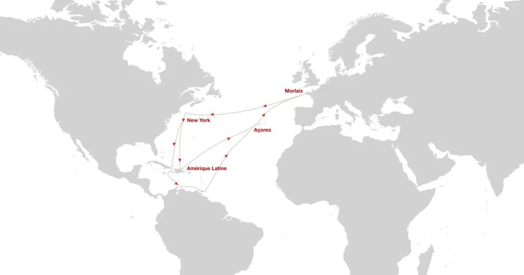 Notre trajet dépend bien sûr des conditions météorologiques, des aléas climatiques, de notre équipage, de nos fournisseurs et de nos produits… Il est donc complètement évolutif et devrait se transformer petit à petit lors de chaque traversée ! Comme dit le capitaine, « On sait quand on part mais pas quand on arrive… » C’est le principe du transport à la voile.