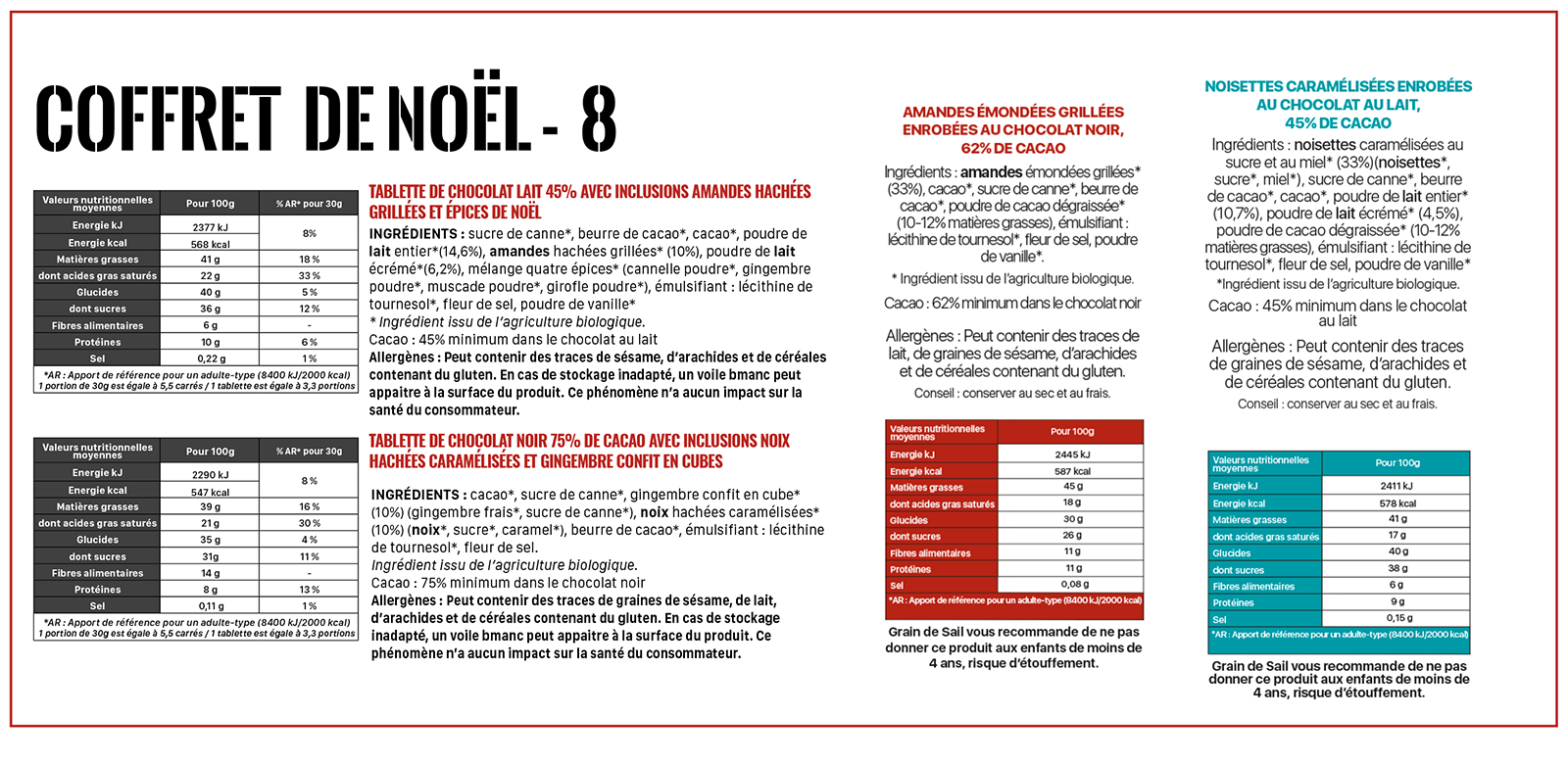 Nos tablettes peuvent contenir les allergènes suivants: lait, fruits à coque, arachides, graines de sésame, céréales contenant du gluten.