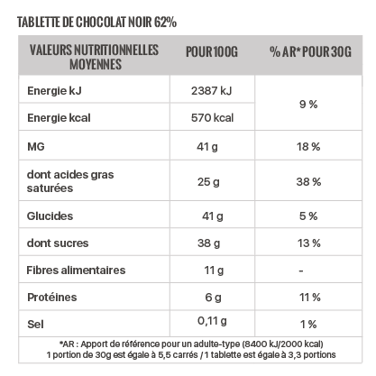 Ingrédients : cacao*, sucre de canne*, beurre de cacao*, fleur de sel, poudre de vanille*, émulsifiant : lécithine de tournesol*